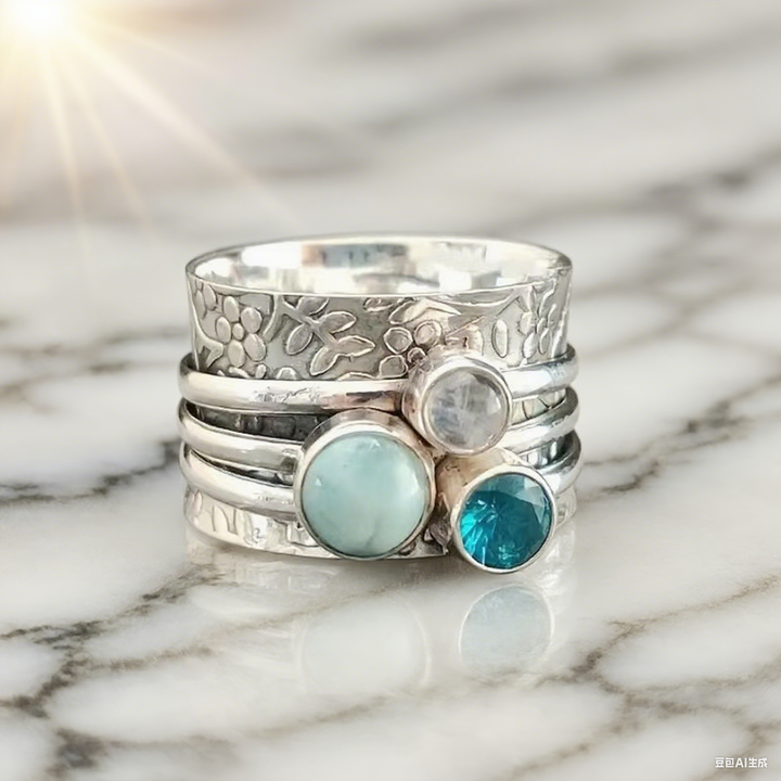 Elevate your jewelry collection with these stunning handmade bohemian rings! Expertly crafted by skilled artisans, these rings are each set with natural turquoise, dazzling zircon, and shimmering moonstone. Unique details, from the delicate floral motif on the silver band to the vibrant colors of the gemstones, perfectly capture the free-spirited essence of bohemian style. Whether worn alone for a statement piece or layered with other pieces, these rings add a touch of bohemian chic to any look. They're the perfect gift for yourself or the bohemian-inspired woman in your life.