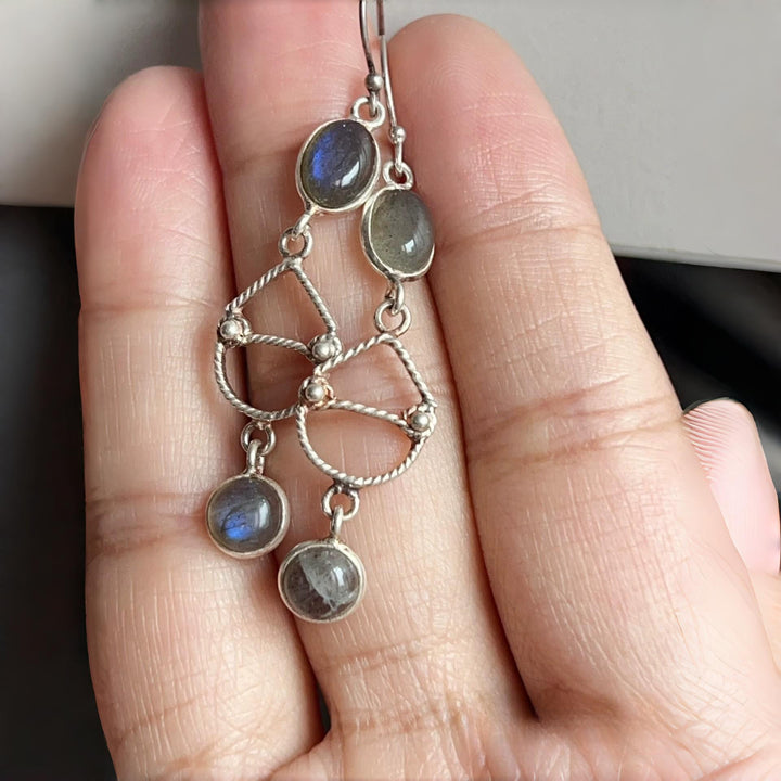 Meticulously handcrafted by artisans, these bohemian-inspired labradorite earrings celebrate natural beauty and individuality. Each earring showcases a unique gemstone set in sterling silver, offering a bold and eclectic aesthetic. Perfect for those who appreciate jewelry that expresses creativity and free spirit.