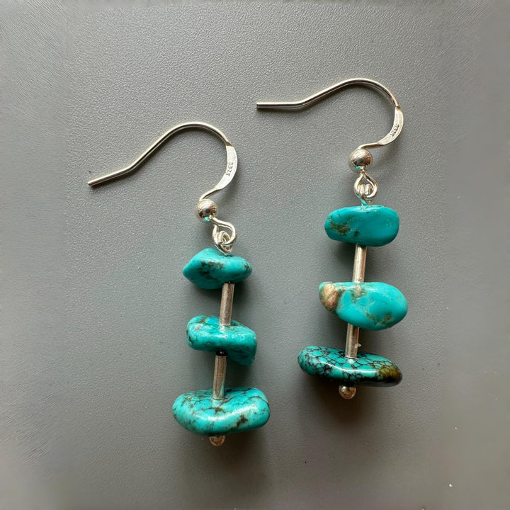 Meticulously handcrafted by artisans, these irregular turquoise earrings celebrate natural beauty and individuality. Each earring features uniquely shaped turquoise set in sterling silver, creating a bold, bohemian aesthetic. Perfect for those who love jewelry that expresses artistic spirit and defies convention.
