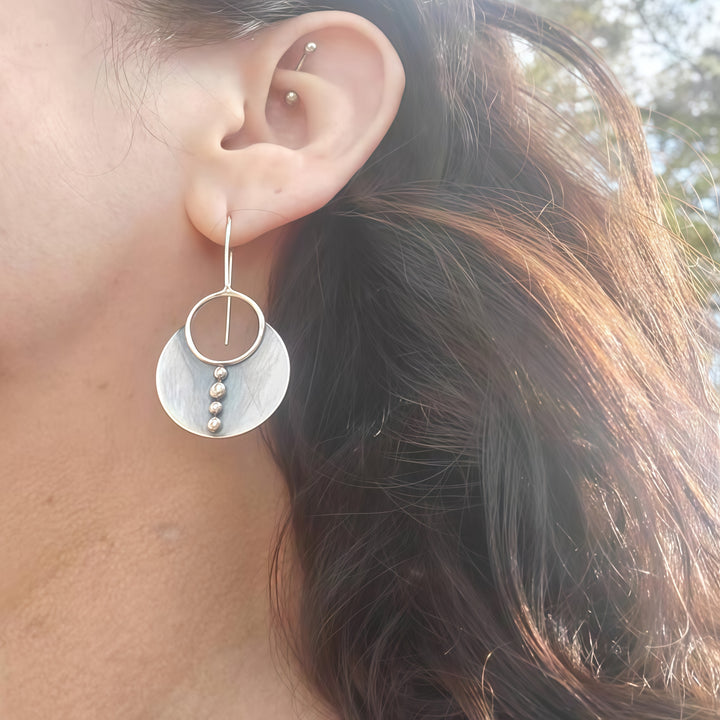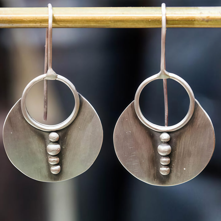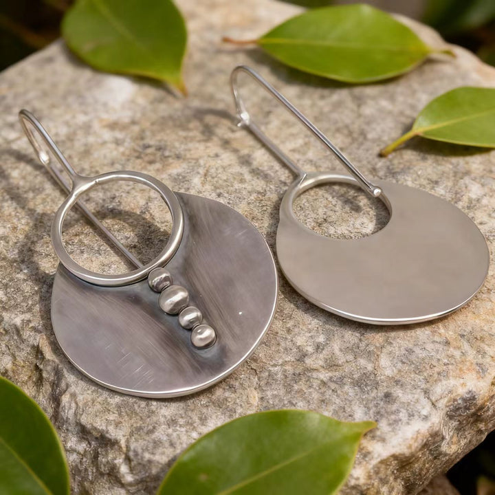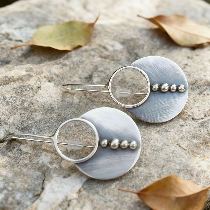Unique Bohemian Disc Design: The combination of the large circular silver disc, smaller ring, and row of rounded accents creates a distinct bohemian aesthetic. The design is both elegant and eye-catching, making these earrings a standout accessory that can effortlessly complement a wide range of outfits, from bohemian-inspired dresses to modern casual wear.