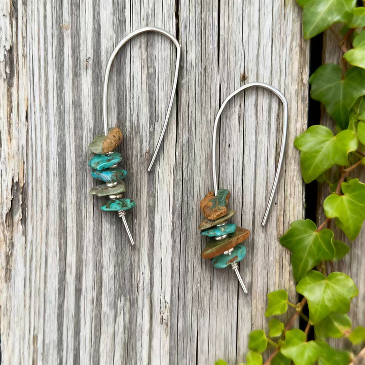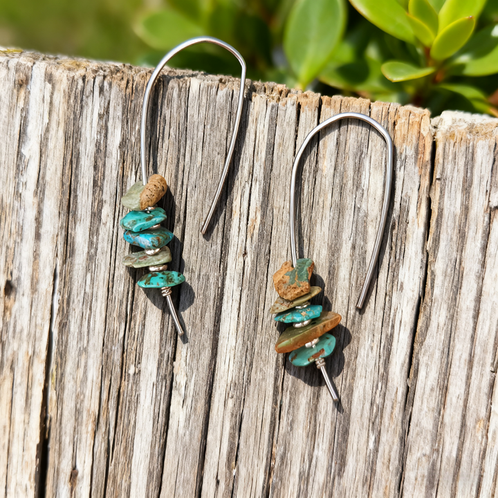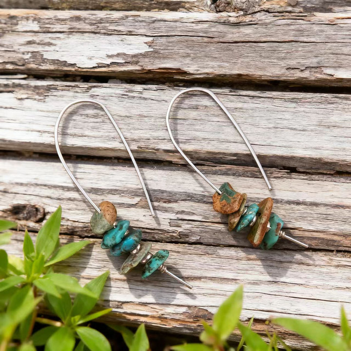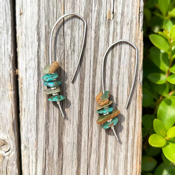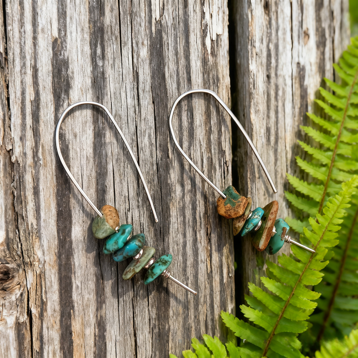 Indulge in the rustic charm of bohemian fashion with these exquisitely handmade 925 silver earrings. Each earring features a gracefully arched 925 silver hook, from which dangle a collection of irregularly shaped natural turquoise beads. The varying shades of blue and green, along with the unique patterns within the turquoise, create a mesmerizing and organic look. The combination of the sleek silver and the earthy turquoise makes these earrings a perfect accessory for women who love distinctive, artisanal jewelry. Whether you're heading to a music festival, a casual outdoor brunch, or simply looking to add a touch of bohemian flair to your daily outfit, these earrings are sure to become a favorite in your jewelry collection.