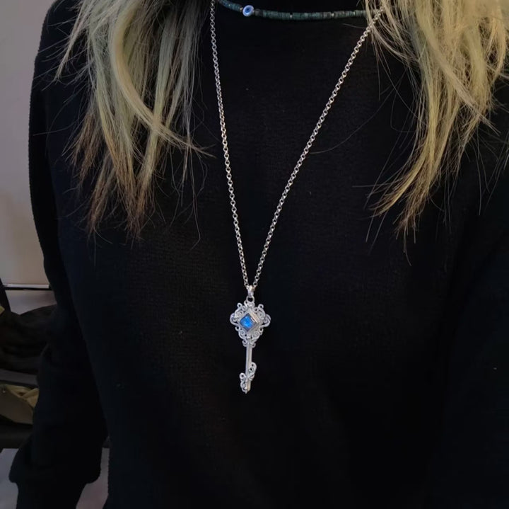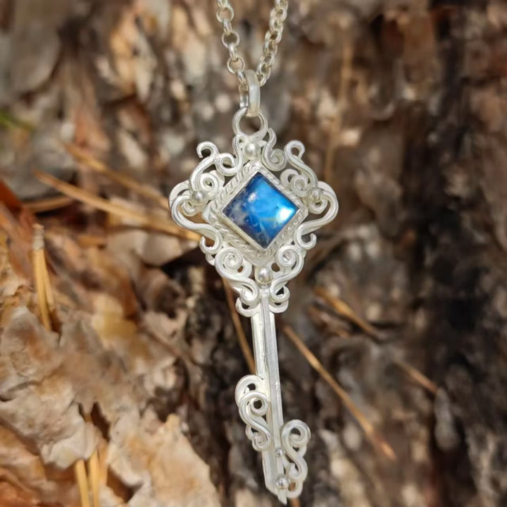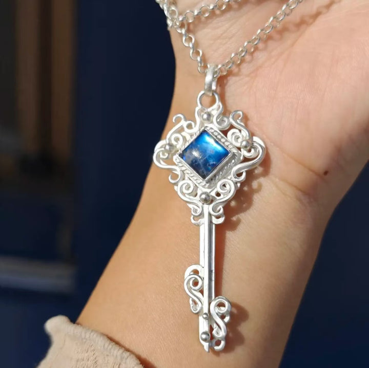 Indulge in the allure of exquisite craftsmanship with this handmade necklace, a perfect blend of elegance and charm. The necklace features a durable titanium steel chain that gracefully suspends a stunning pendant. The pendant, crafted from high - quality 925 silver, is designed in the shape of a key, adorned with intricate, hand - forged scrollwork that adds a touch of vintage flair. At the heart of the key pendant, a mesmerizing blue moonstone is delicately inlaid, its iridescent glow adding a magical touch. Ideal for American women who appreciate unique, artisanal jewelry, this necklace is a wonderful accessory to elevate any outfit, whether you're attending a formal event, a casual gathering, or simply going about your daily routine.