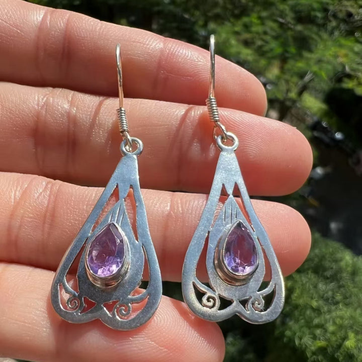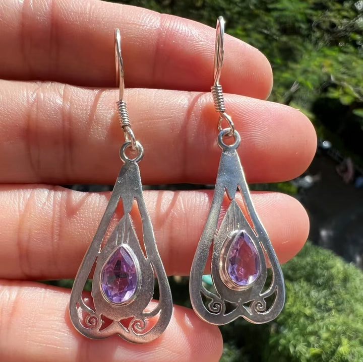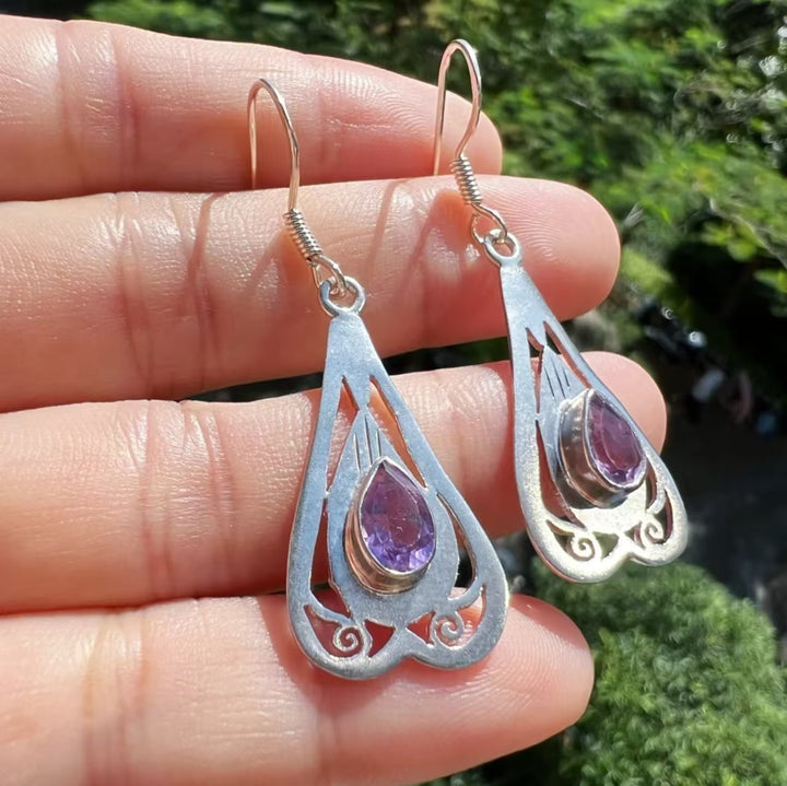 Handmade 925 Sterling Silver Bohemian Amethyst Drop Earrings