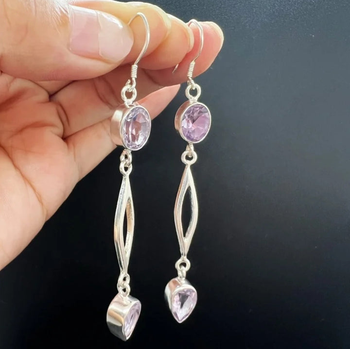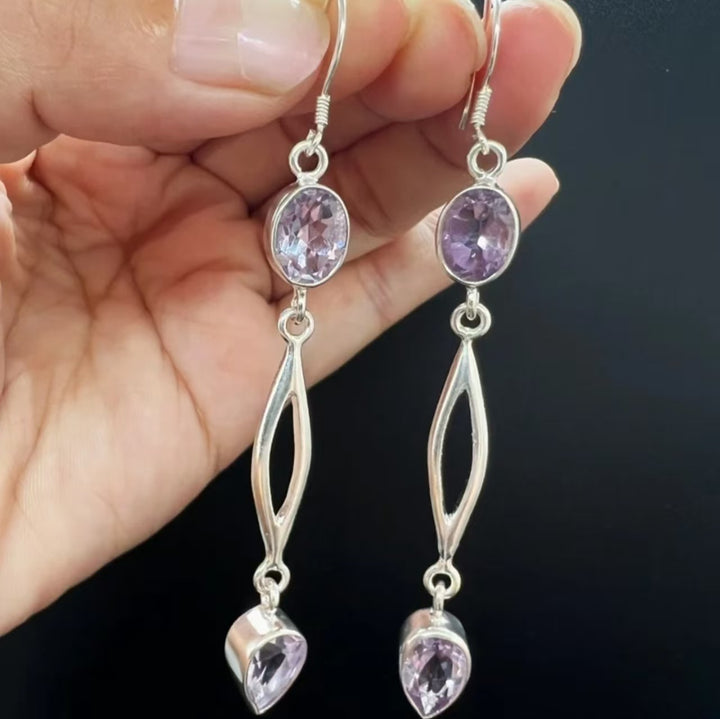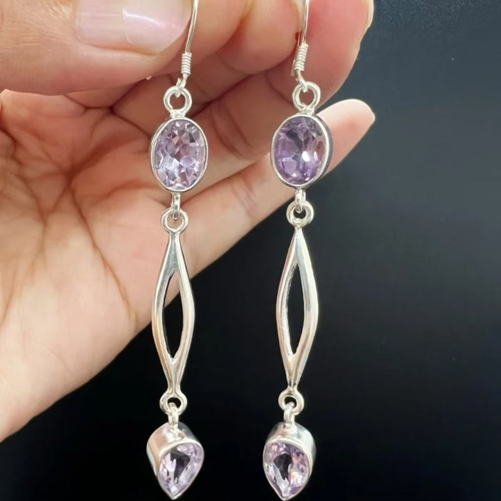 Elevate your style with these exquisitely handmade 925 sterling silver dangle earrings. Each pair showcases stunning amethyst gemstones in both oval and teardrop shapes, delicately suspended from intricately crafted silver elements. The combination of the soft purple hues of the amethyst and the sleek silver design creates a harmonious blend of elegance and bohemian charm. Ideal for American women who appreciate unique, artisanal jewelry, these earrings are perfect for adding a touch of sophistication and a pop of color to any outfit. Whether you're dressing up for a special occasion or enhancing your everyday look, they're sure to make a statement.