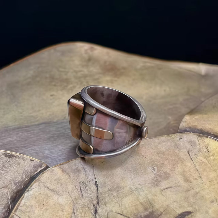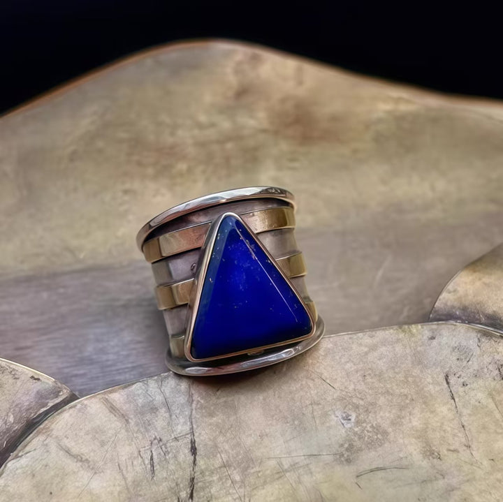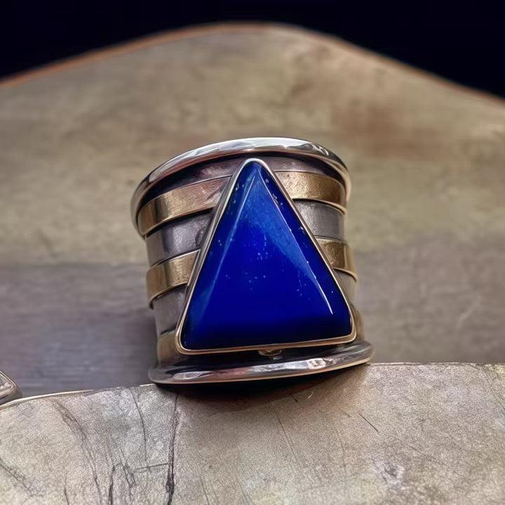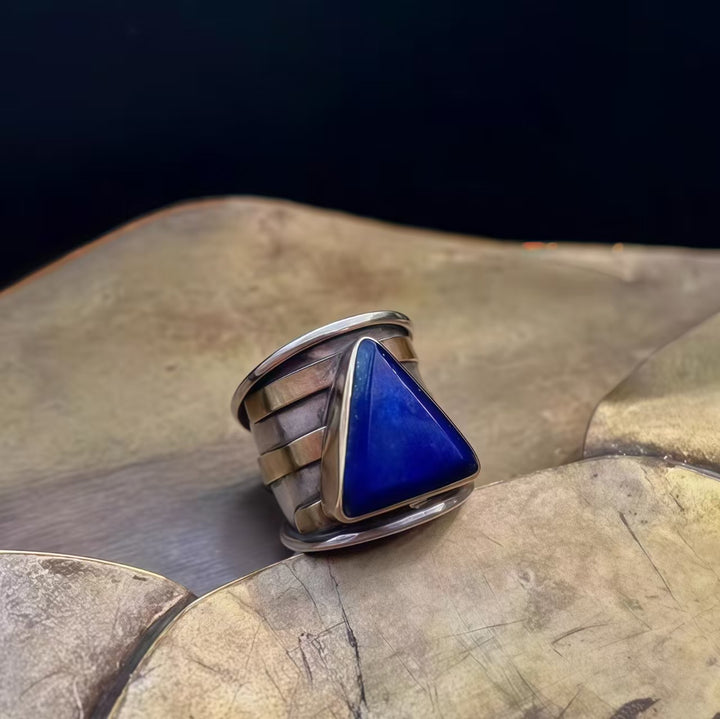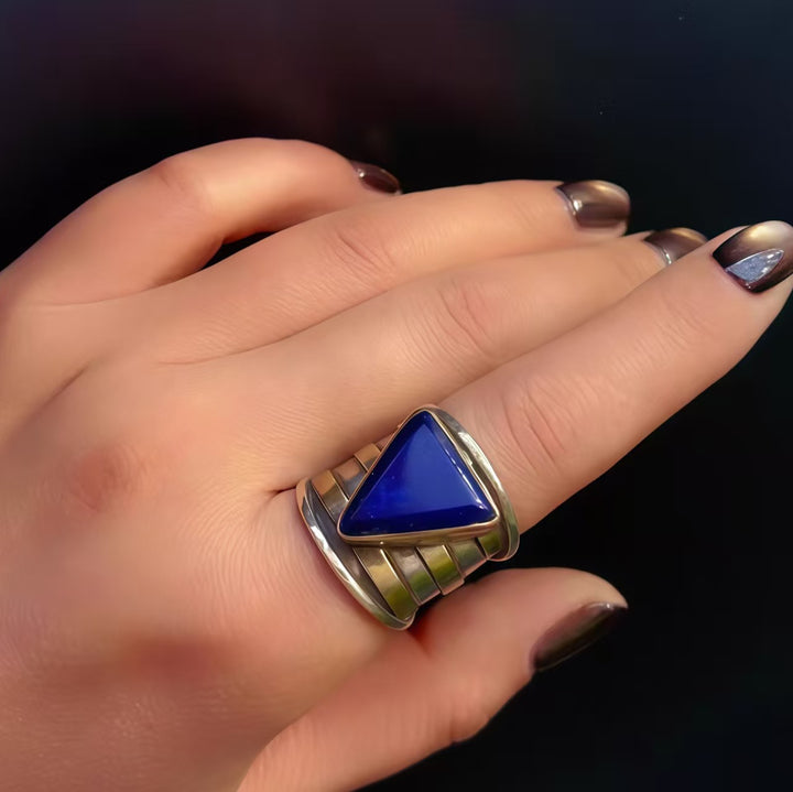 Triangle Lapis Lazuli Geometric Design: The lapis lazuli, set in a polished silver band with layered metallic detailing, creates a visually bold and avant-garde look. Lapis lazuli’s rich blue hue adds depth and allure, making this ring both a stylish and symbolic piece that complements bohemian, edgy, or modern outfits.