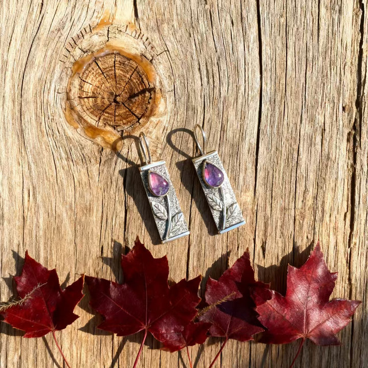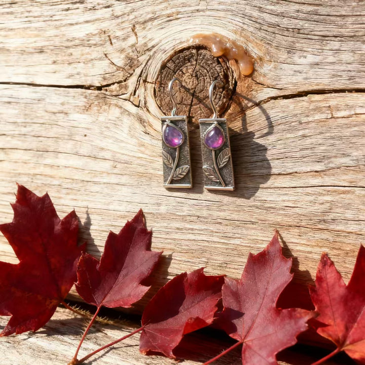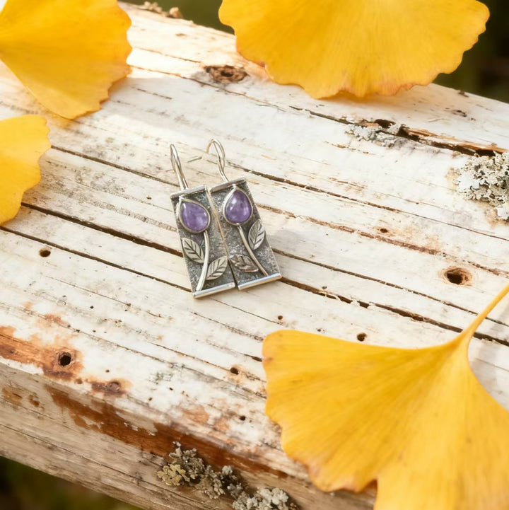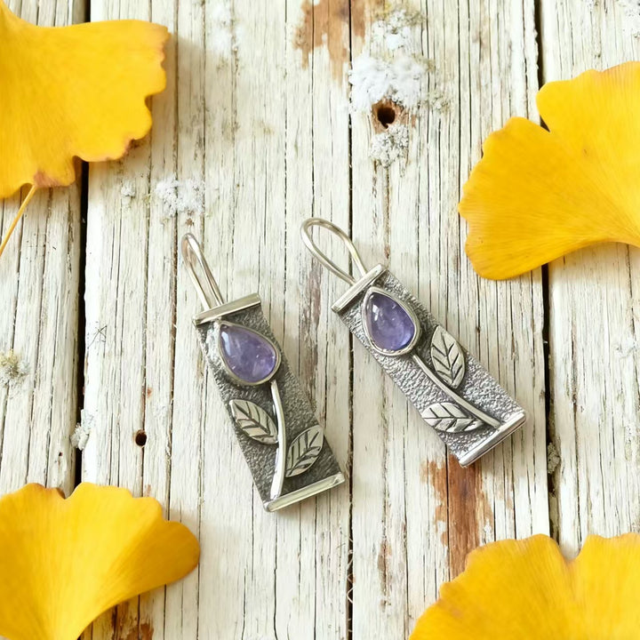 Handmade Bohemian 925 Sterling Silver Botanical Drop Earrings with Amethyst Accents