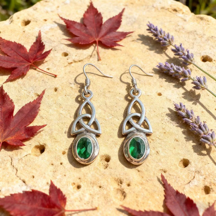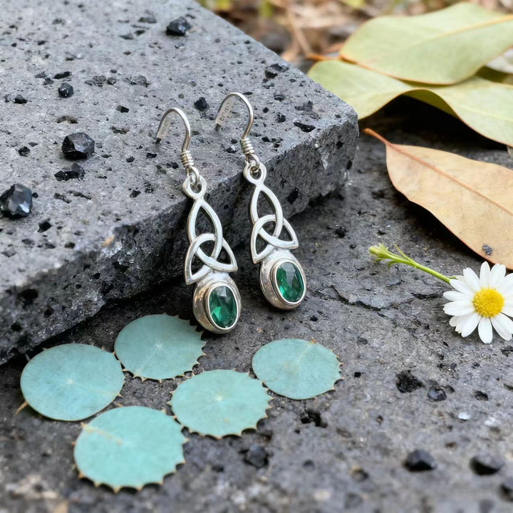 Handmade Bohemian 925 Sterling Silver Celtic Knot Dangle Earrings with Green Crystal Accents