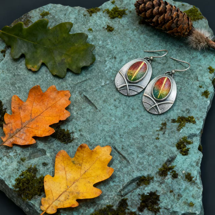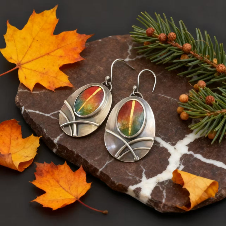 Step into the world of bohemian artistry with these exquisitely handmade 925 sterling silver earrings. Each earring features an oval multi-color natural agate gemstone, showing a vibrant gradient of red, orange, and green hues that embody the free-spirited essence of bohemian style. The silver framework, with its intricate geometric detailing and oxidized finish, perfectly complements the agate’s brilliance, making these earrings a standout accessory for anyone who values unique, hand-crafted jewelry.