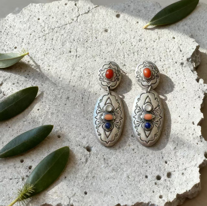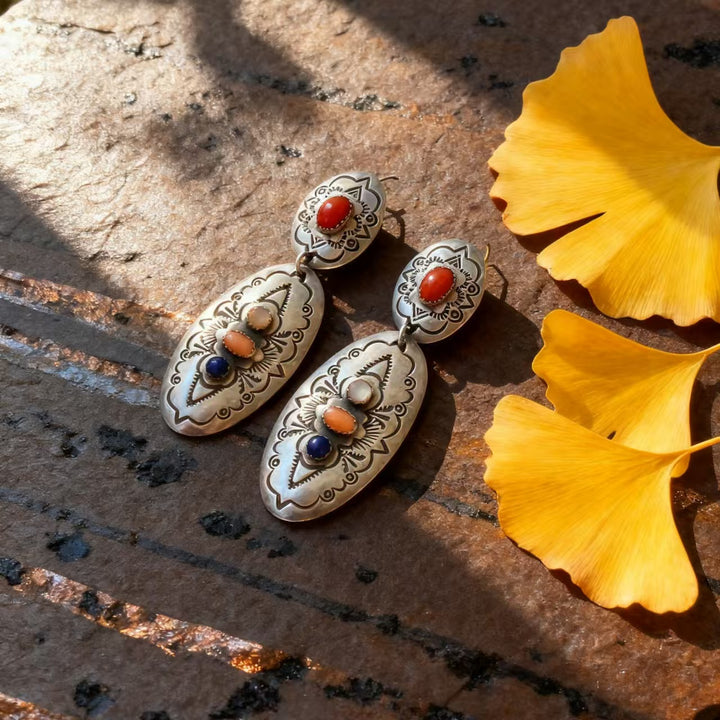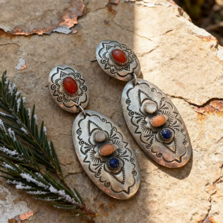 Step into the world of bohemian ethnic artistry with these exquisitely handmade sterling silver earrings. Each earring features a richly detailed design, adorned with a curated mix of vibrant gemstones that embody the free-spirited essence of bohemian style. The silver framework, with its intricate stamping and oxidized finish, makes these earrings a standout accessory for anyone who values unique, hand-crafted jewelry.