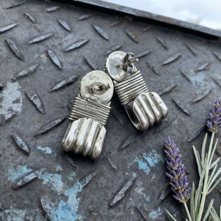 Step into the world of bohemian ethnic artistry with these exquisitely handmade 925 sterling silver earrings. Each earring features a bold, sculptural design, showcasing vibrant turquoise gemstones that embody the free-spirited essence of bohemian style. The silver framework, with its intricate coiled detailing and artistic shaping, makes these earrings a standout accessory for anyone who values unique, hand-crafted jewelry.