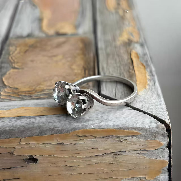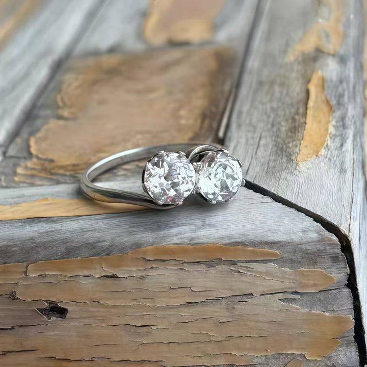Double Round Cubic Zirconia Design: The two round cubic zirconia stones, set in a polished silver band, create a striking statement look. Their sparkling brilliance adds depth and allure, making this ring both a stylish and eye-catching piece that complements bohemian, modern, or elegant outfits.