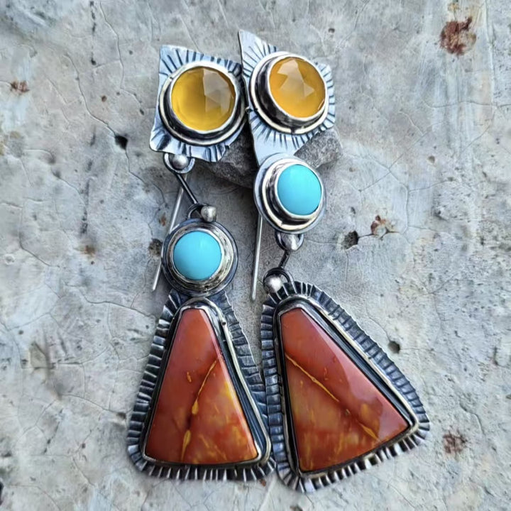 Step into the vibrant world of bohemian artistry with these exquisitely handmade 925 sterling silver earrings. Each earring is a masterpiece of design, featuring a layered arrangement of natural gemstones—vibrant yellow agate, serene turquoise, and striking orange spiny oyster. The silver framework is meticulously crafted with textured details, enhancing the organic beauty of the gemstones and creating a piece that radiates free - spirited charm.