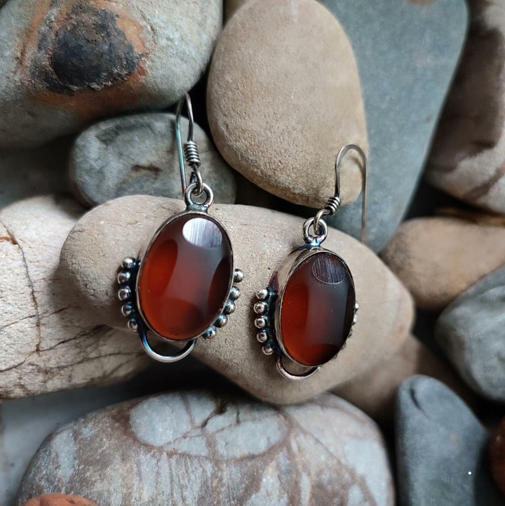 Step into the world of bohemian elegance with these exquisitely handmade 925 sterling silver earrings. Each earring features an oval red agate gemstone, showcasing a rich, deep red hue that exudes warmth and sophistication. The silver framework, with its intricate beaded detailing and oxidized finish, perfectly complements the agate’s brilliance, creating a piece that balances rustic charm and artistic refinement.