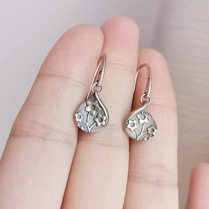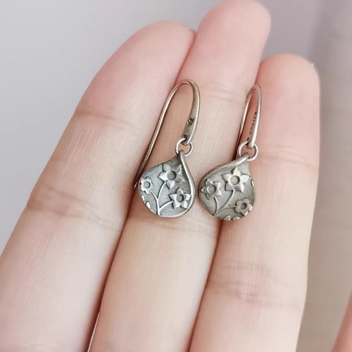 Artisan Handmade: Meticulously crafted by hand, each pair is one-of-a-kind. Every step, from shaping the 925 sterling silver into teardrop forms to stamping floral patterns, reflects exceptional craftsmanship and attention to detail.