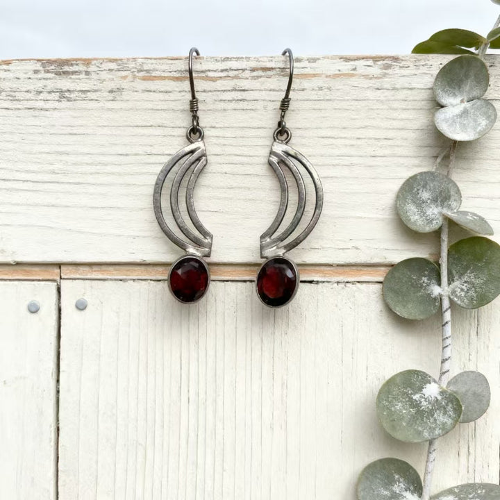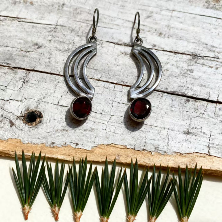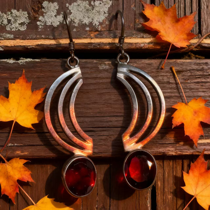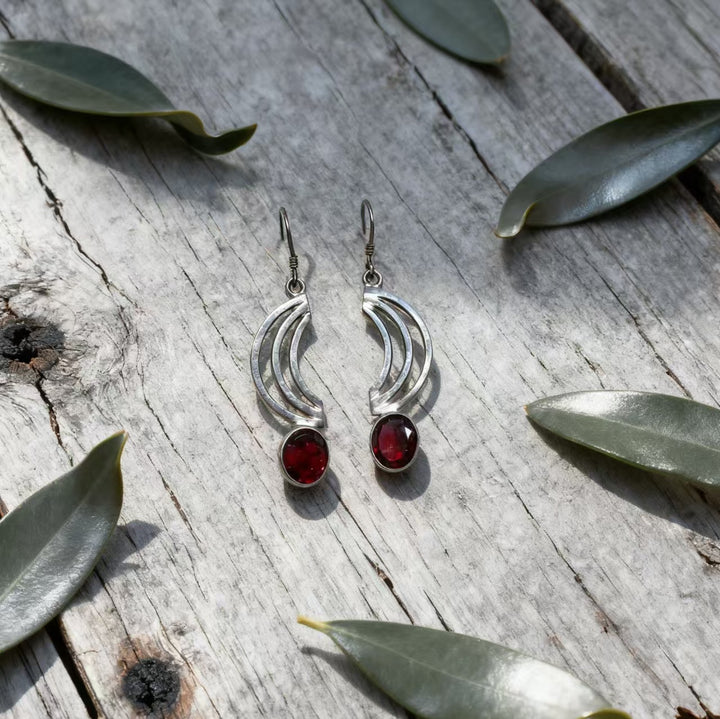 Artisan Handmade: Meticulously crafted by hand, each pair is one-of-a-kind. Every step, from shaping the 925 sterling silver into crescent forms to setting garnet gems and adding geometric cutout detailing, reflects exceptional craftsmanship and attention to detail.