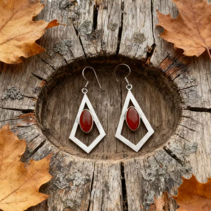 Handmade Bohemian 925 Sterling Silver Geometric Drop Earrings with Red Agate Accents