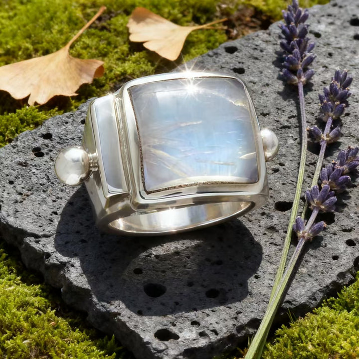 Bold Geometric Moonstone Design: The large square moonstone, set in a polished silver geometric frame, creates a striking statement look. Moonstone’s mystical iridescence adds depth and allure, making this ring both a stylish and symbolic piece that complements bohemian, modern, or eclectic outfits.