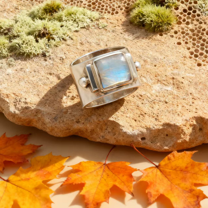 Artisan Handmade: Meticulously crafted by hand, each ring is one-of-a-kind. Every step, from shaping the 925 sterling silver into the geometric statement form to setting the moonstone and finishing the band, reflects exceptional craftsmanship and attention to detail.