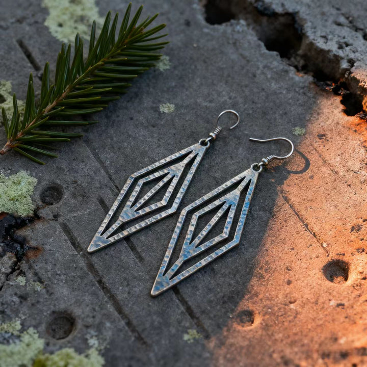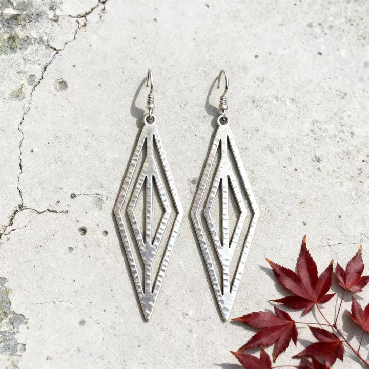 Handmade Bohemian 925 Sterling Silver Hammered Diamond - Shaped Drop Earrings