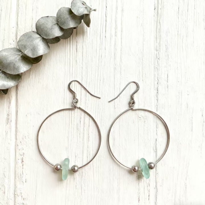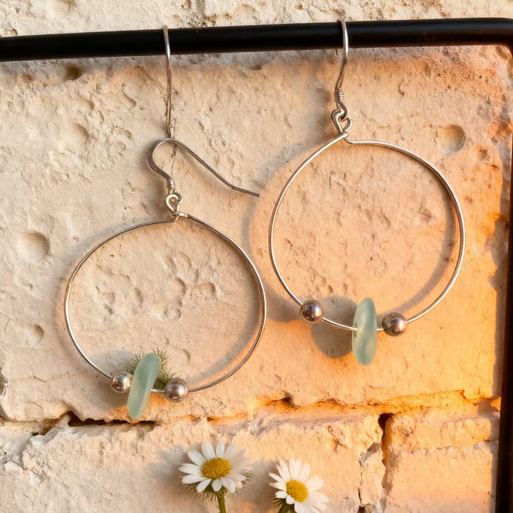 Handmade Bohemian 925 Sterling Silver Hoop Earrings with Irregular Aquamarine Accents