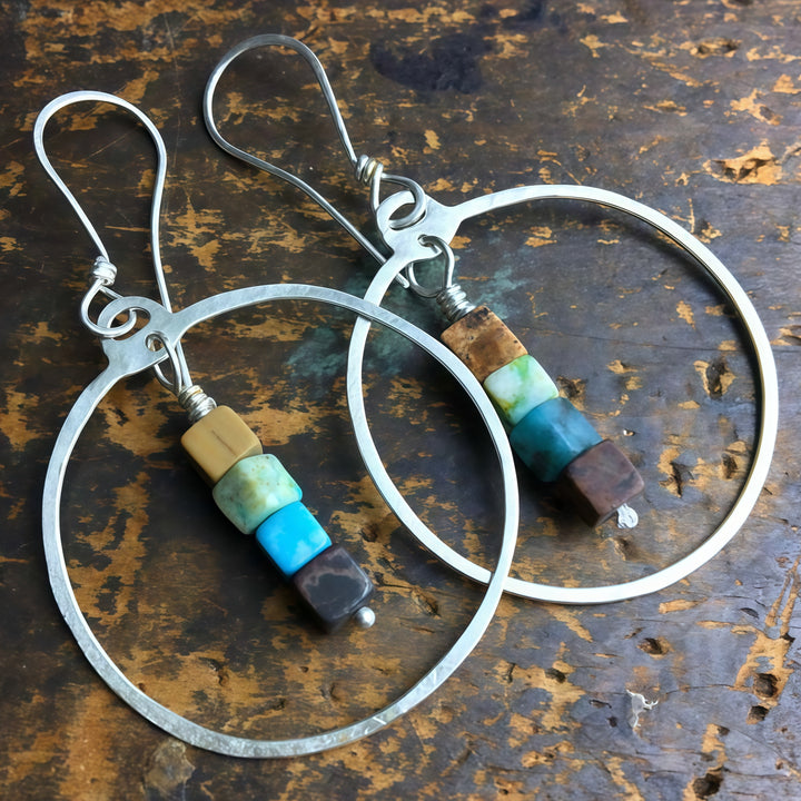 Handmade Bohemian 925 Sterling Silver Hoop Earrings with Multi - Natural Stone Accents