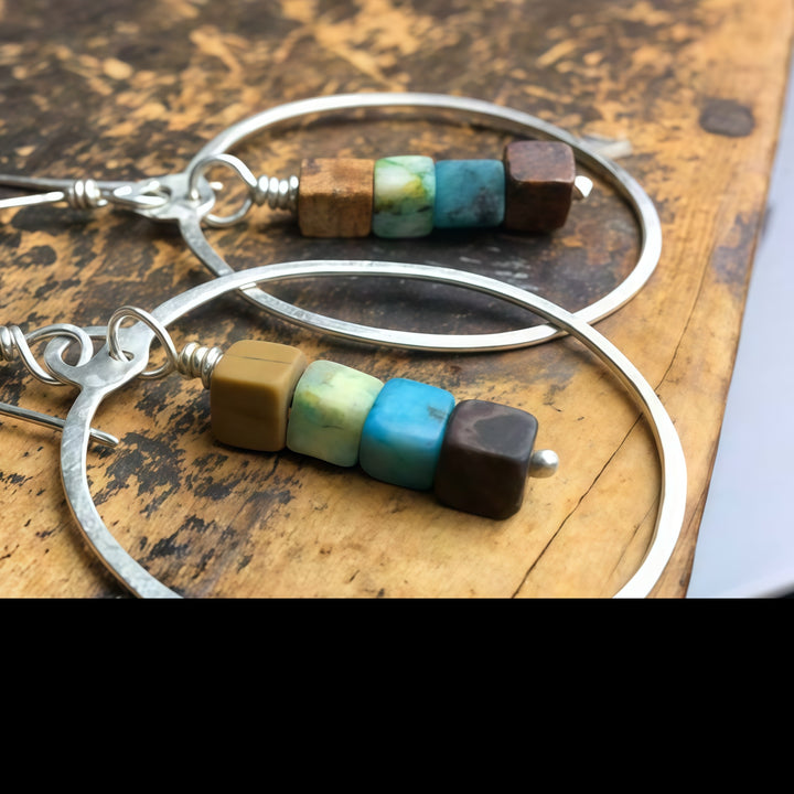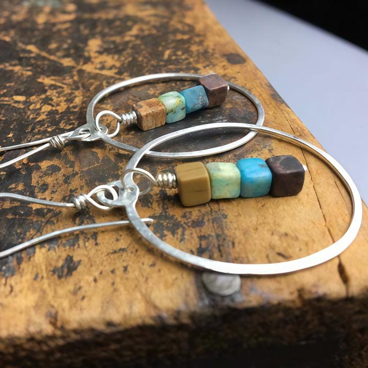 The craftsmanship is evident in every detail, from the careful selection and arrangement of each natural stone to the precise shaping and texturing of the 925 sterling silver hoops. These earrings are a perfect blend of artistic flair and timeless elegance, making them an ideal accessory for anyone who values unique, hand-crafted jewelry.