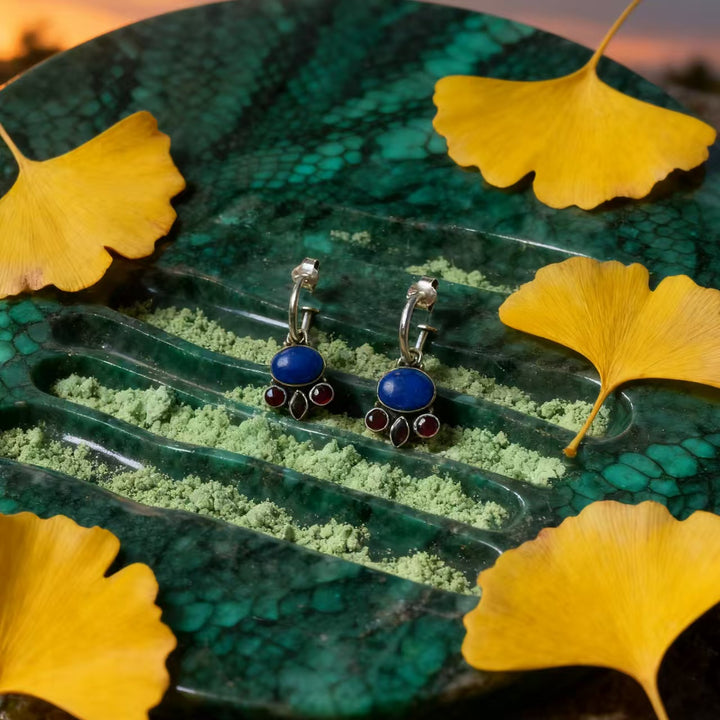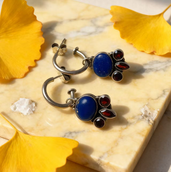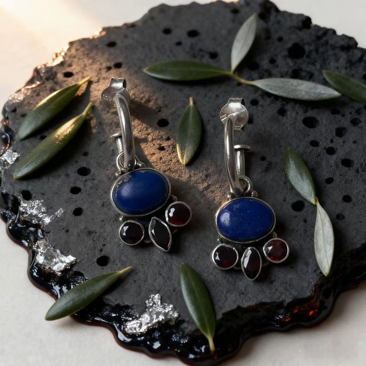 Artisan Handmade: Meticulously crafted by hand, each pair is one-of-a-kind. Every step, from shaping the 925 sterling silver to setting lapis lazuli and garnet gems, reflects exceptional craftsmanship and attention to detail.