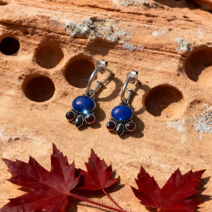 Handmade Bohemian 925 Sterling Silver Multi-Gemstone Drop Earrings with Lapis Lazuli and Garnet Accents