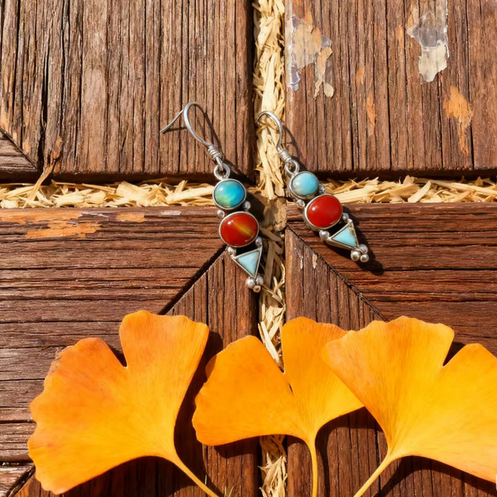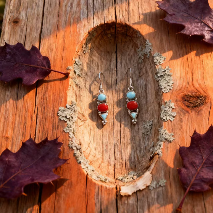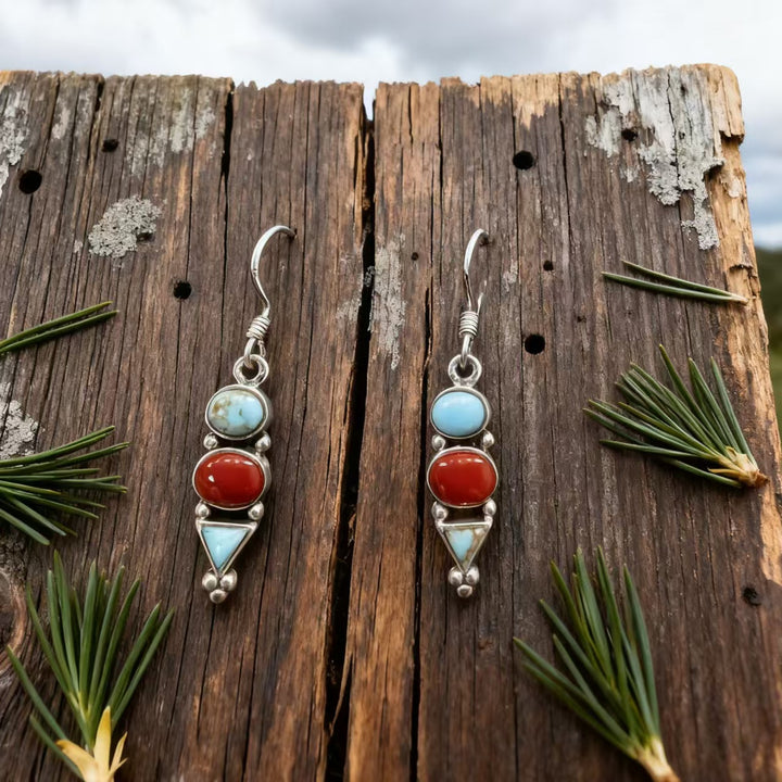 Handmade Bohemian 925 Sterling Silver Multi-Gemstone Drop Earrings with Turquoise and Red Agate Accents
