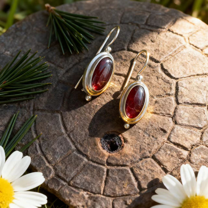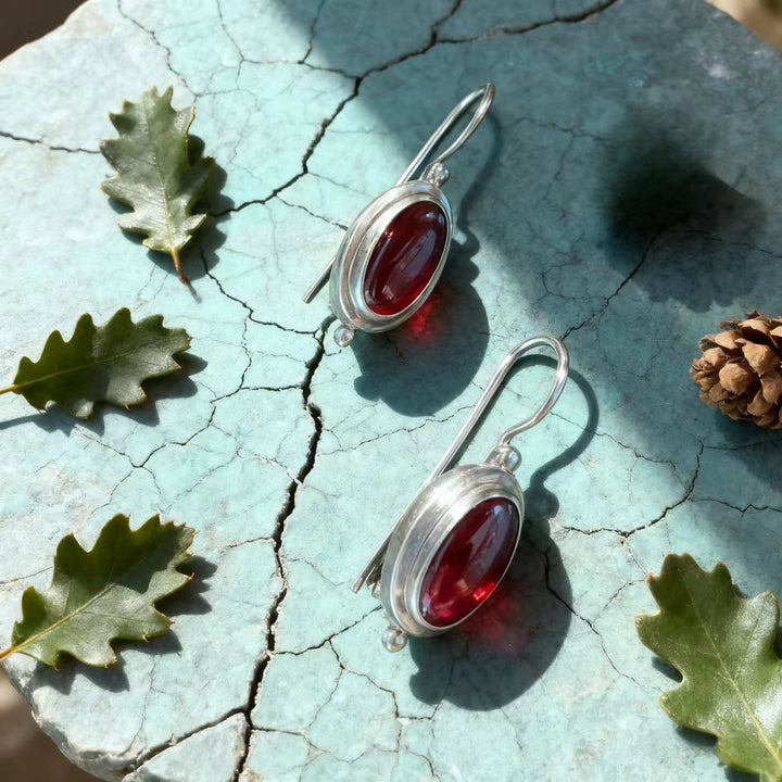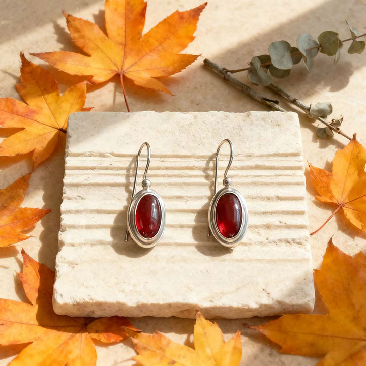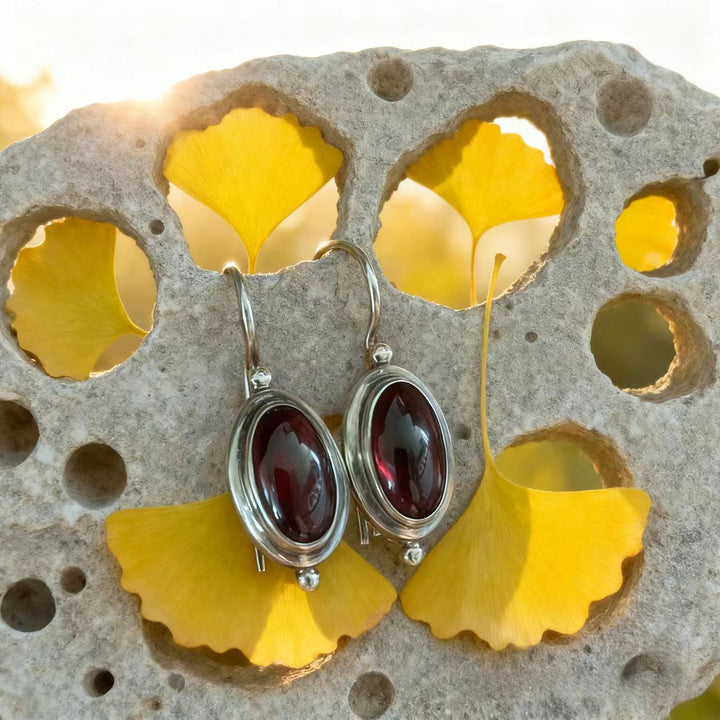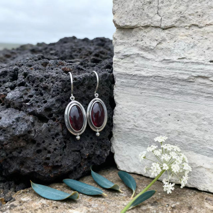 Artisan Handmade: Meticulously crafted by hand, each pair is one-of-a-kind. Every step, from shaping the 925 sterling silver into oval forms to setting the garnet gems, reflects exceptional craftsmanship and attention to detail.