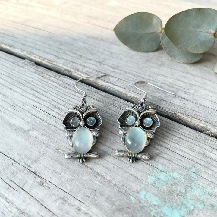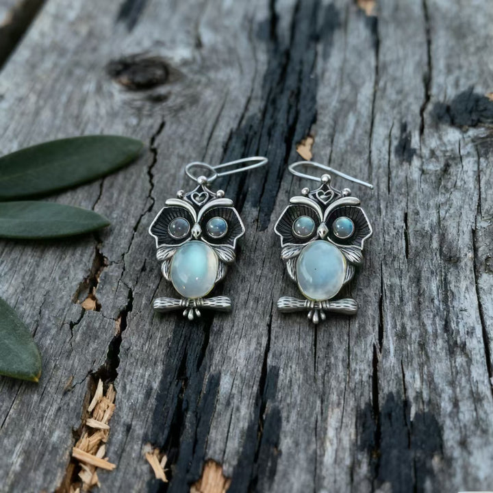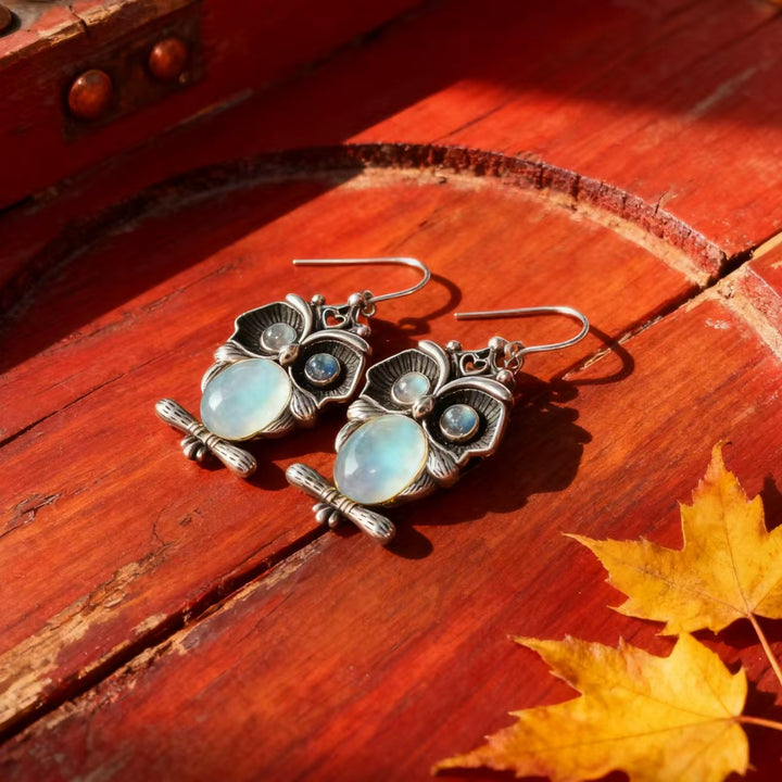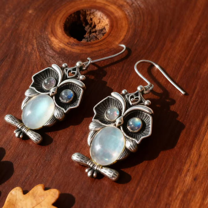 Handmade Bohemian 925 Sterling Silver Owl Dangle Earrings with Moonstone Accents