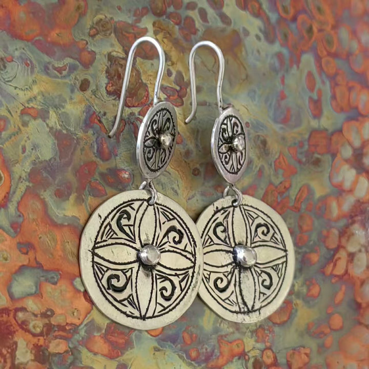 Handmade Bohemian 925 Sterling Silver Tribal Disc Dangle Earrings with Intricate Stamping