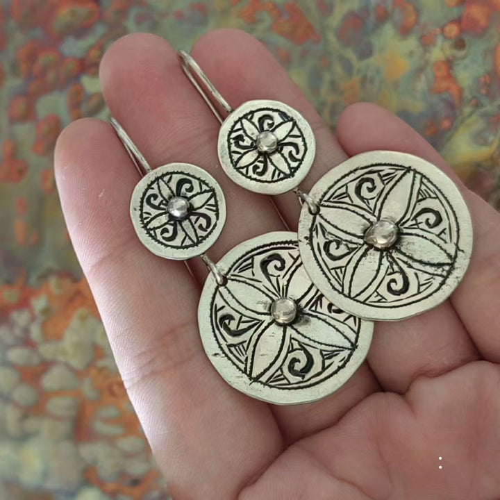 Step into the world of bohemian tribal artistry with these exquisitely handmade 925 sterling silver earrings. Each earring features layered disc designs with intricate tribal stamping, embodying the free-spirited essence of bohemian style. The silver framework, with its detailed artistic etching, textured accents, and vintage-inspired shaping, makes these earrings a standout accessory for anyone who values unique, hand-crafted jewelry.