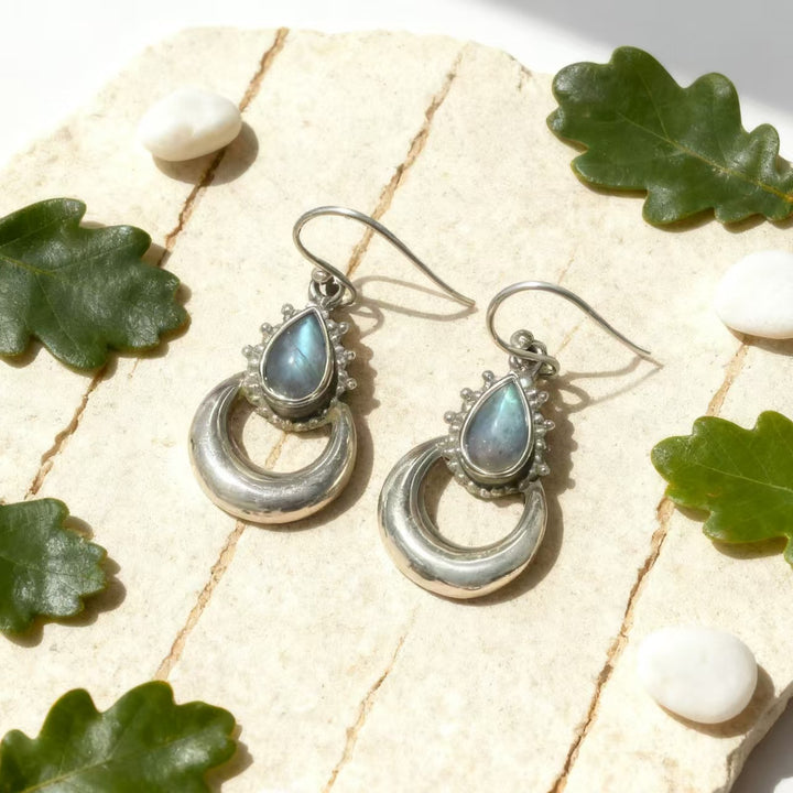 Handmade Bohemian 925 Sterling Silver Vintage Moon Dangle Earrings with Labradorite Accents