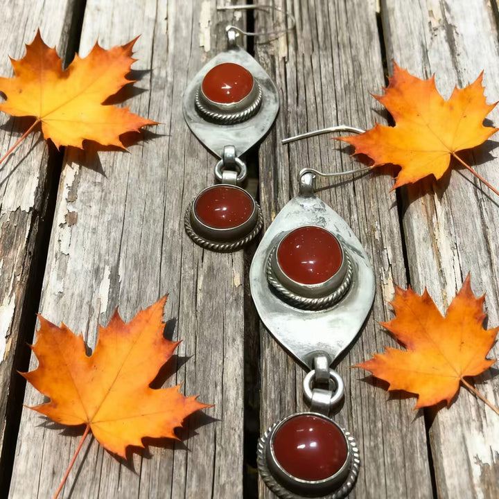 The craftsmanship is evident in every detail, from the precise setting of each red agate stone to the meticulous finishing of the 925 sterling silver teardrop elements. These earrings are a perfect blend of artistic flair and retro charm, ideal for women drawn to bohemian and vintage-inspired accessories. Whether you’re at a cultural event, a casual gathering, or simply infusing your daily look with boho sophistication, these earrings are sure to become a beloved part of your jewelry collection.