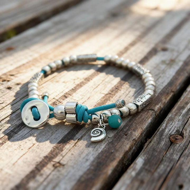 Embrace the free - spirited charm of bohemian style with this exquisitely handmade adjustable silver bracelet. Skillfully crafted, it features a delightful combination of silver beads in various shapes and textures, interspersed with vibrant turquoise elements and a charming silver spiral charm. The soft turquoise cord adds a pop of color and flexibility, allowing for easy adjustment to fit any wrist comfortably. Perfect for American women who love unique, artisanal jewelry, this bracelet is ideal for adding a touch of bohemian flair to any outfit, whether you're heading to a music festival, a casual outdoor gathering, or just elevating your daily look.