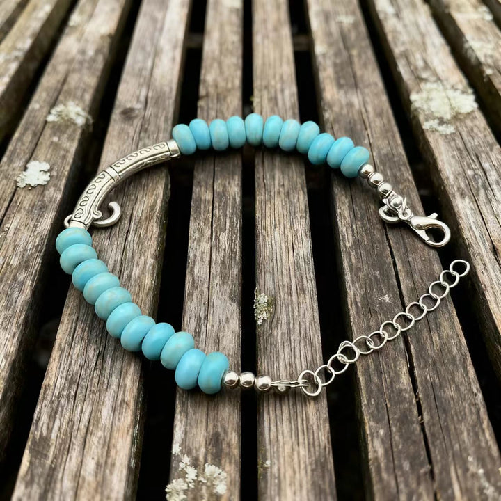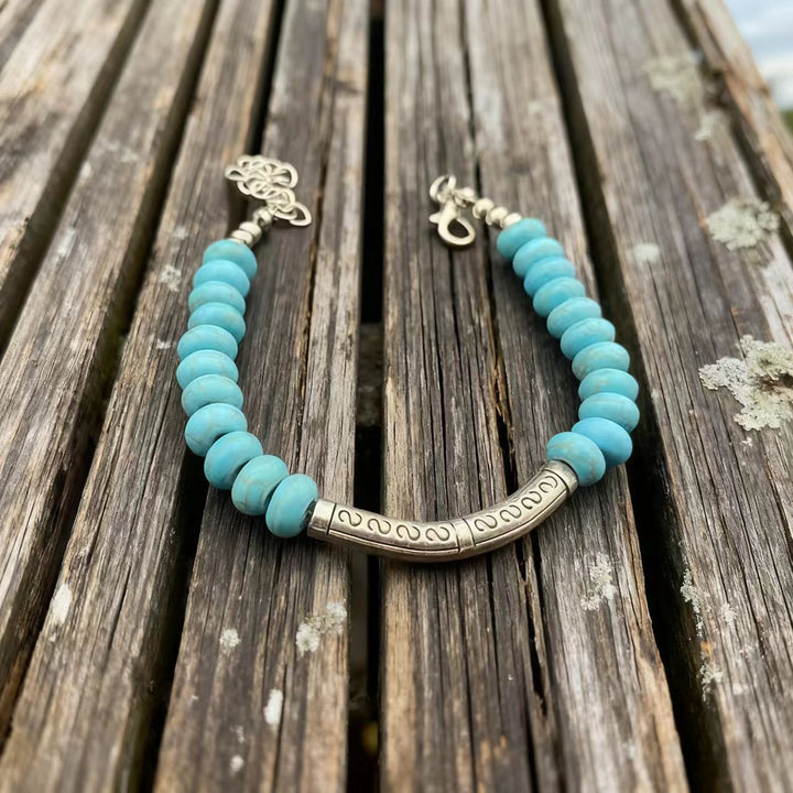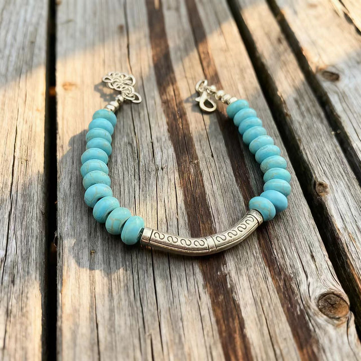 Artisan Handmade: Each bracelet is meticulously crafted by hand, guaranteeing that no two pieces are exactly alike. The careful stringing of the turquoise beads and the integration of the engraved silver tube showcase exceptional craftsmanship and attention to detail.