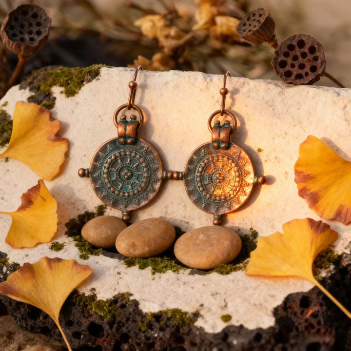 Handmade Bohemian Copper Dangle Earrings with Tribal Mandala Design