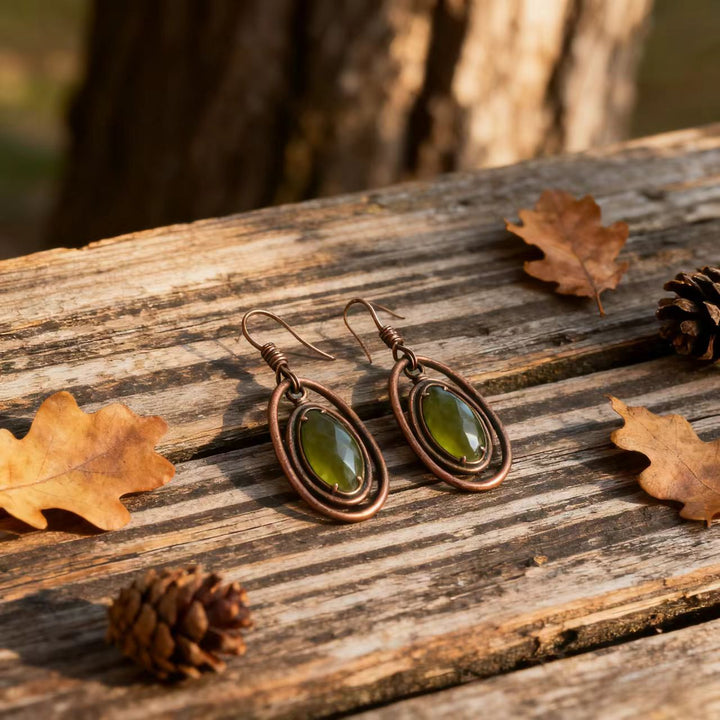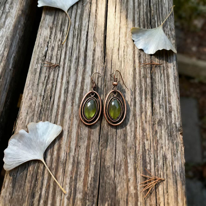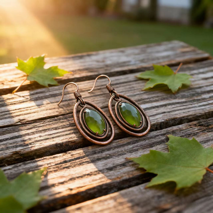 Embrace the allure of bohemian fashion with these exquisitely handmade copper earrings. Each earring features a captivating design, with an oval - shaped green gemstone at its heart, delicately inlaid within two interlocking copper rings. The rich, warm hue of the copper beautifully complements the vibrant green of the gemstone, creating a striking visual contrast. Crafted with meticulous attention to detail, these earrings are the perfect accessory for American women who love unique, artisanal jewelry. Whether you're heading to a music festival, a casual outdoor gathering, or looking to add a touch of bohemian elegance to your daily look, these earrings are sure to become a standout piece in your collection.