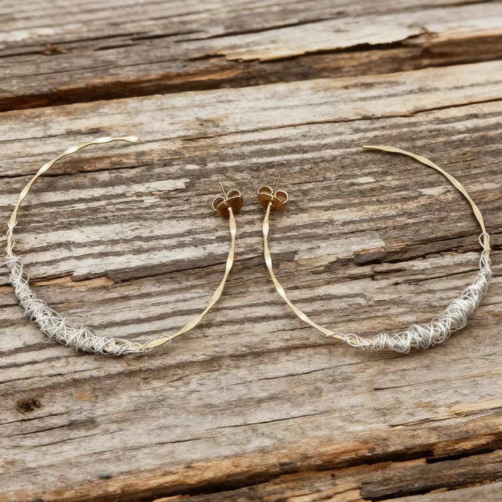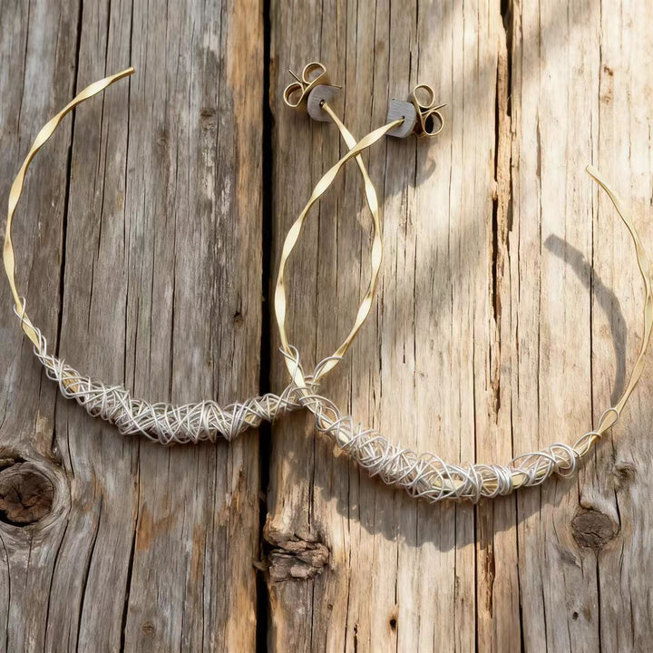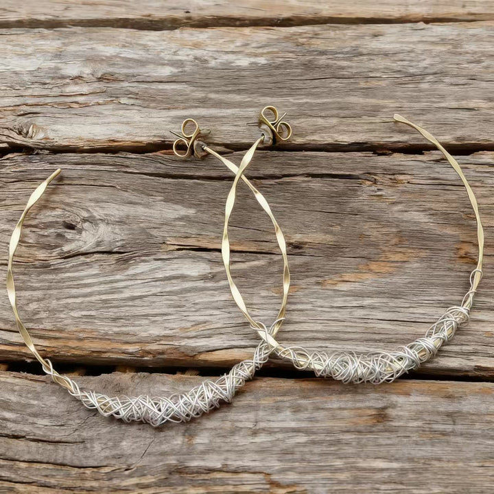Handmade Bohemian Copper Hoop Earrings with Silver Wire Weaving