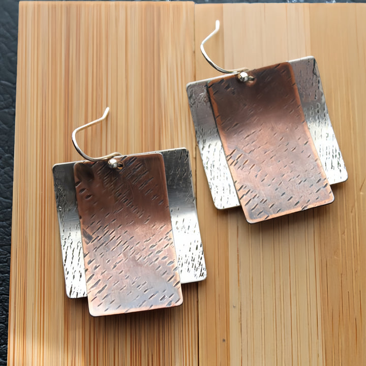 Handmade Bohemian Silver and Copper Layered Rectangle Earrings for Women