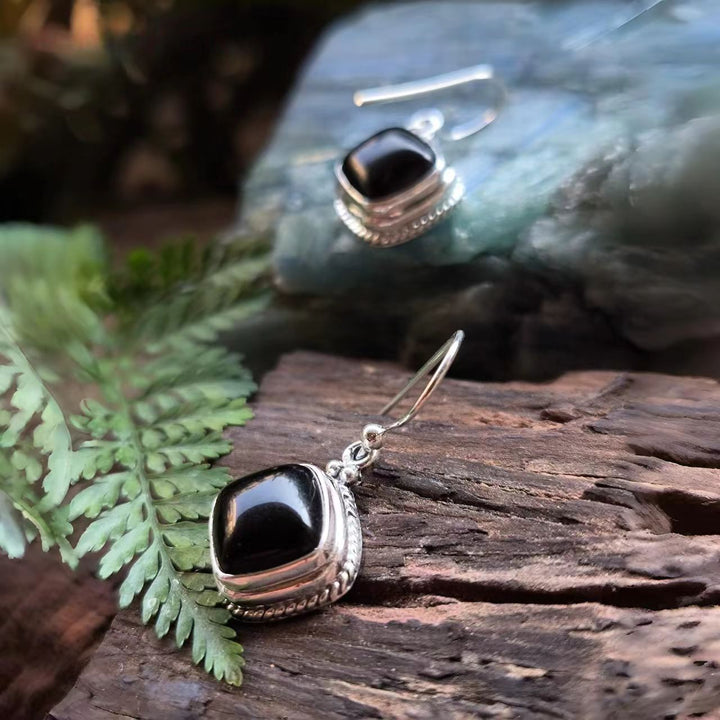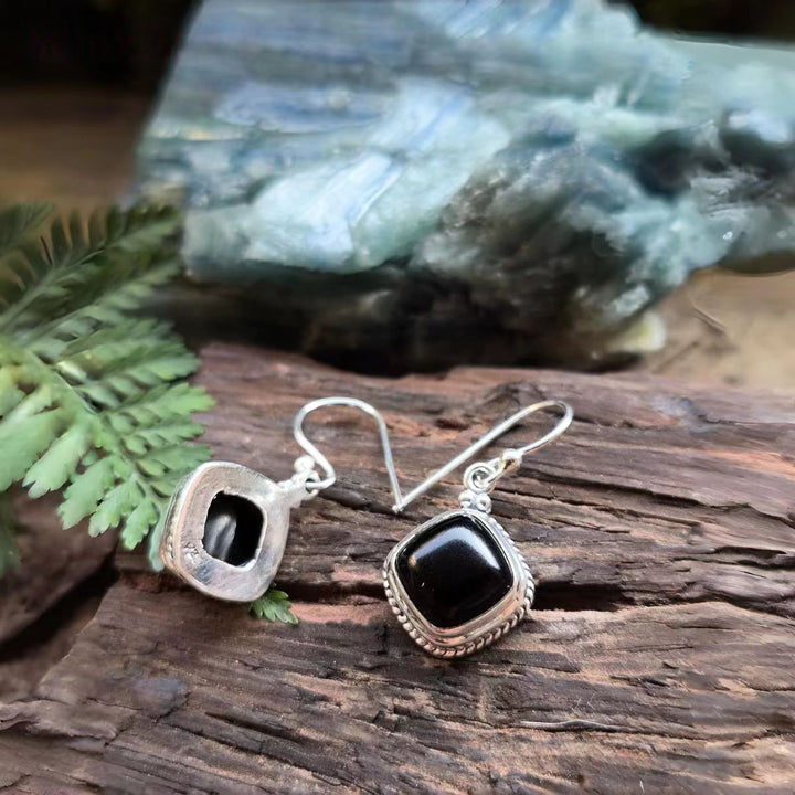 Handmade Bohemian Silver Earrings Inlaid with Black Agate