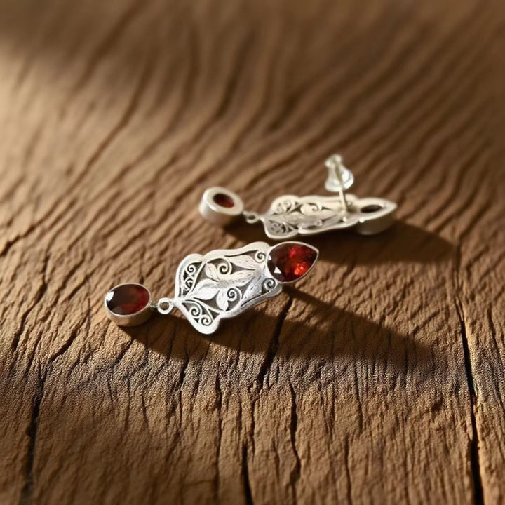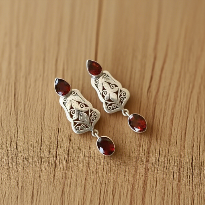 Unique Design: The elaborate floral and swirling motifs on the silver, paired with the dual - garnet arrangement, create a distinctive and eye - catching design. This uniqueness makes the earrings stand out in any jewelry collection.