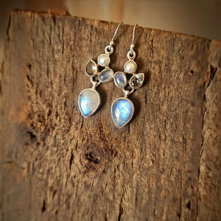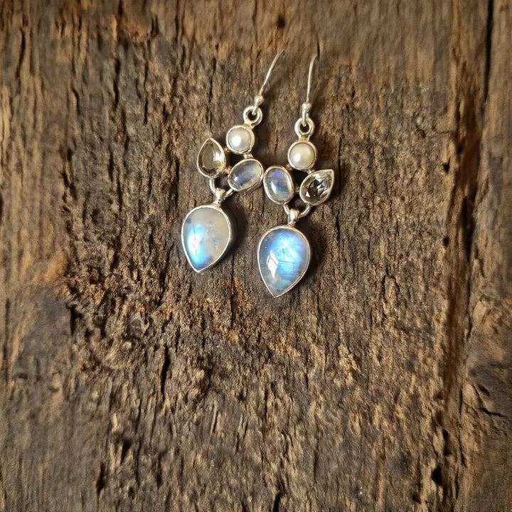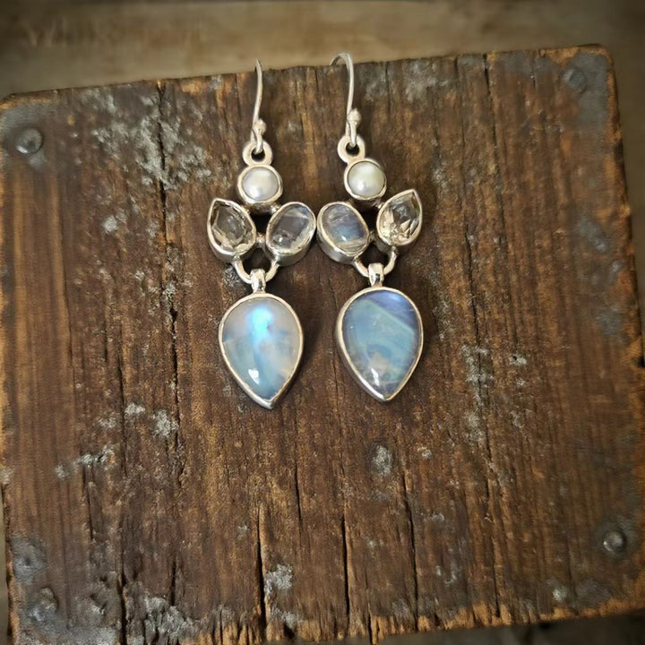 Handmade Bohemian Silver Earrings Inlaid with Moonstone, Crystal and Pearl