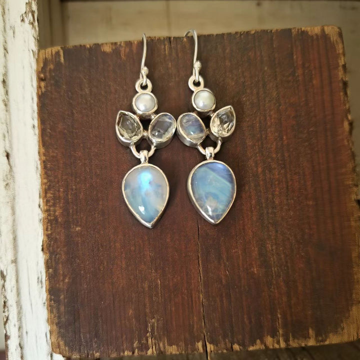 Intricate Design: The thoughtful arrangement of different gemstones creates a harmonious and eye-catching design. The unique shapes and colors of the moonstone, crystal, and pearl add layers of visual interest, making these earrings stand out in any jewelry collection.