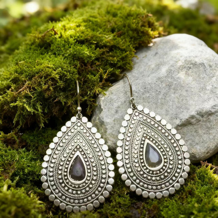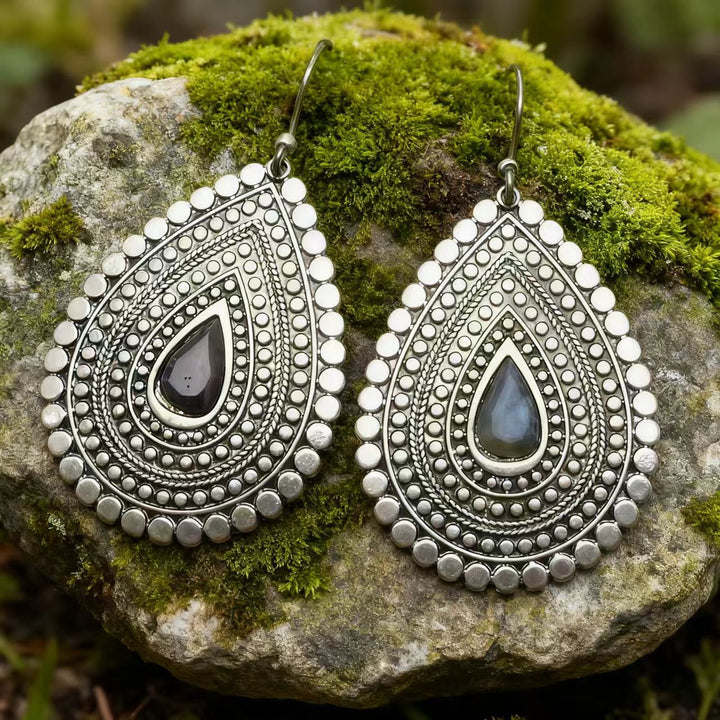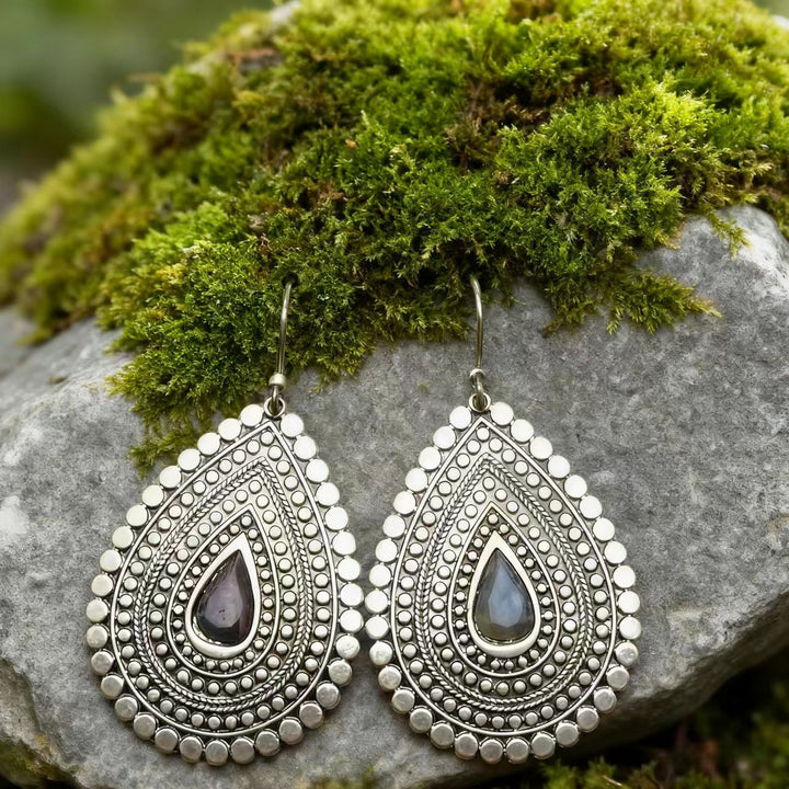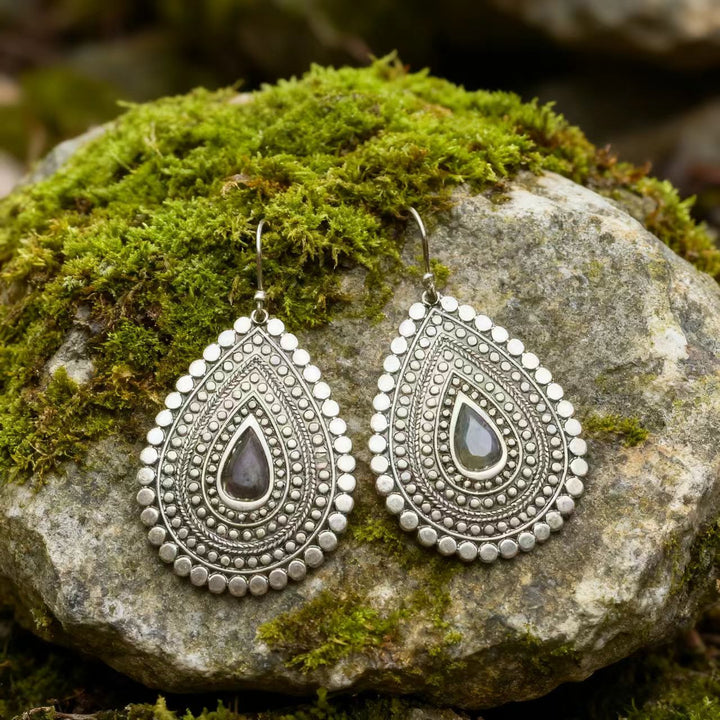 Step into the enchanting world of bohemian fashion with these exquisitely handmade silver earrings. Each earring showcases a teardrop - shaped design, meticulously crafted from high - quality silver. The intricate pattern, adorned with delicate circular and linear details, is both eye - catching and elegant. At the heart of each earring, a stunning labradorite stone is inlaid, adding a touch of natural beauty and iridescence. silver's lustrous finish. Ideal for women who cherish unique, artisanal jewelry, these earrings are the perfect accessory to add a touch of bohemian charm to any outfit. Whether you're heading to a music festival, a casual outdoor gathering, or simply looking to elevate your daily look, these earrings are sure to become a beloved part of your collection.