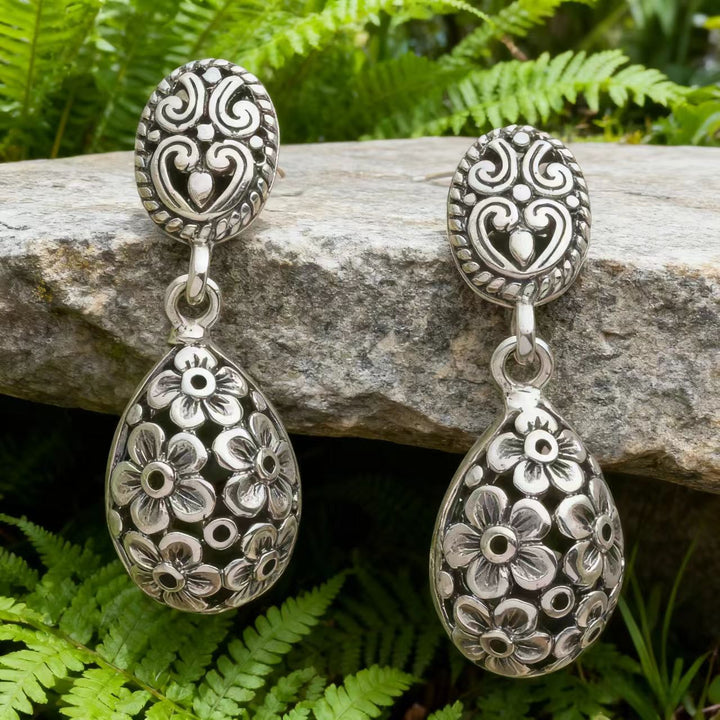 The craftsmanship is evident in every detail, from the precise shaping of the silver to the intricate filigree work that mimics the beauty of blooming flowers. The silver has a classic luster that enhances the overall elegance, making these earrings a perfect blend of artistry and bohemian charm.