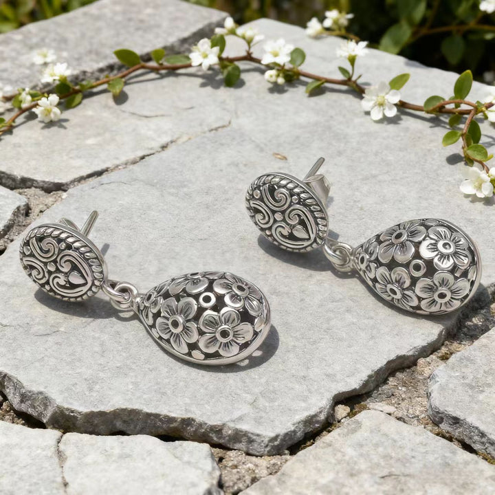 Unique Bohemian Design: The combination of the oval silver top with swirling patterns and the teardrop silver drop with filigree flower details creates a distinct bohemian aesthetic. The design is both eye - catching and elegant, making these earrings a standout accessory that can effortlessly complement a wide range of outfits, from flowy bohemian dresses to casual denim ensembles.