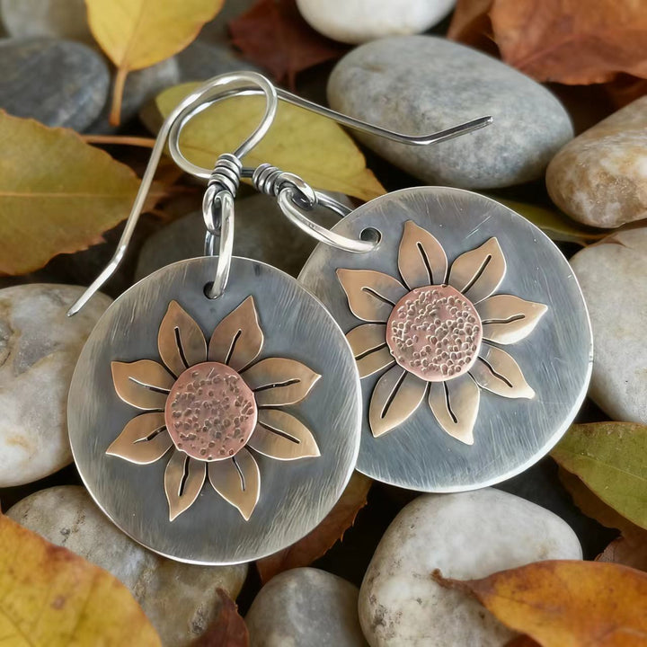Step into the enchanting world of bohemian style with these exquisitely handmade silver floral disc earrings. Each earring features a round silver disc adorned with a beautifully crafted floral design, showcasing a blend of silver and warm - toned metal petals with a textured center. The craftsmanship is evident in the detailed shaping of the flower and the smooth finish of the silver disc, creating a piece that's both artistic and full of bohemian charm. Perfect for women who love unique, handcrafted jewelry, these earrings are ideal for adding a touch of bohemian elegance to any outfit. Whether you're heading to a music festival, a casual gathering, or simply want to elevate your daily look, these earrings are sure to become a beloved accessory.
