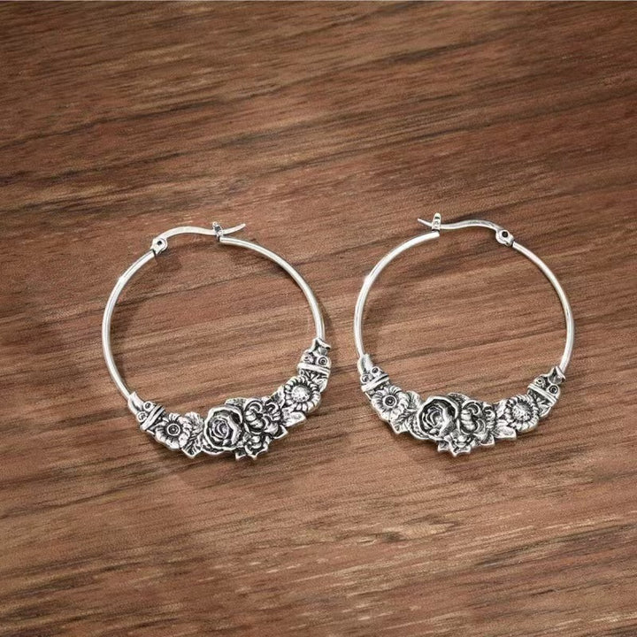 Handmade Bohemian Silver Hoop Earrings with Floral Design